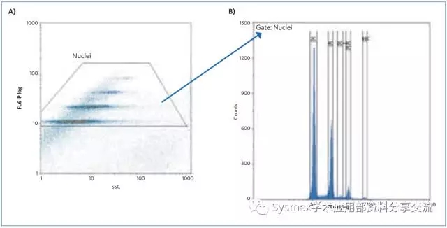 A圖顯示SSCvsFL6(PI發(fā)射),命名為“Nuclei”的門應用與B圖中,B柱形圖顯示“Nuclei”門內FL6峰值。
