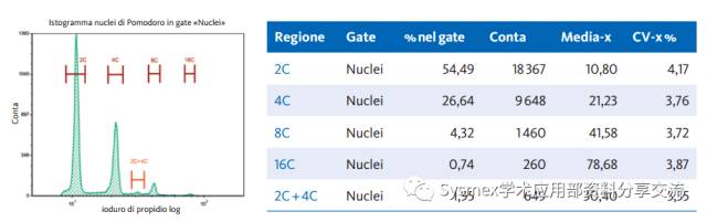 圖2中使用的番茄樣本顯示出核內復制與DNA復制的相關性,如有絲分裂,但是沒有區(qū)分核和細胞自身。核內復制的峰是疊加在經典的細胞周期峰上的: