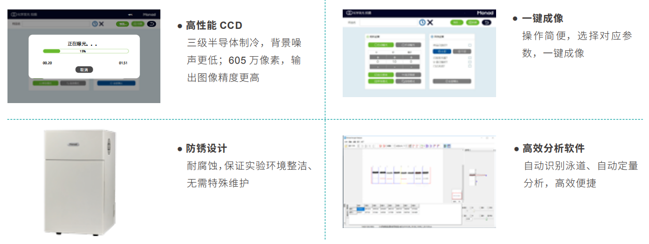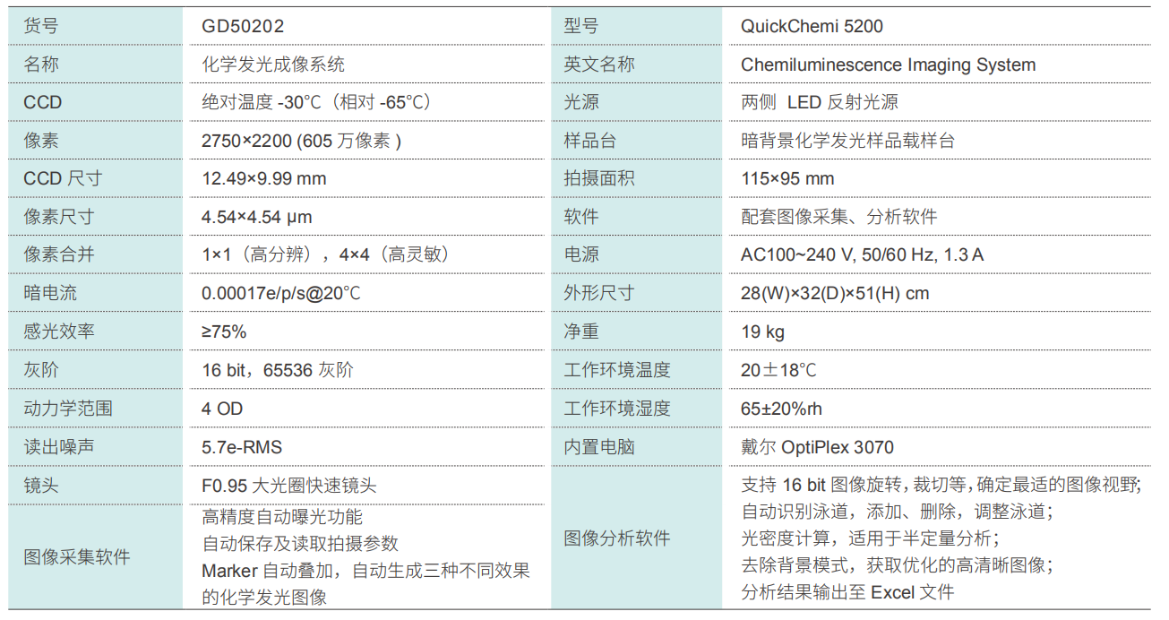 Quickchemi 5200化學(xué)發(fā)光成像系統(tǒng)適用于ECL發(fā)光直接成像,采用三級(jí)深度制冷CCD作為感光芯片,最大程度降低暗電流,提高信噪比。像素值高達(dá)605萬,并具有極高感光效率,結(jié)合F0.95大光圈鏡頭,收集微弱信號(hào)能力更強(qiáng),成像效果更好,速度更快,且線性范圍更寬。特殊設(shè)計(jì)的防銹機(jī)身,簡單大方耐腐蝕;外接 24 寸大屏顯示器,強(qiáng)大的拍攝及分析軟件,操作簡單便捷,拍攝不同信號(hào)強(qiáng)度樣品時(shí),能自動(dòng)匹配拍攝參數(shù),實(shí)現(xiàn)一鍵成像。