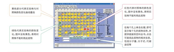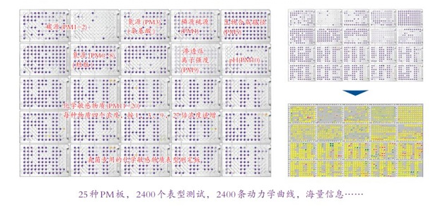 各種不同的PM平板上包被了多種活體細胞生長需要依賴的基質(zhì),因此可以進行不同生長條件下的測試。包括有C.N.P.5.滲適壓.PH值、化學藥物等基質(zhì)條件下細的表型的測試,目前PM表型板25塊,測試的表型達到了2400種,已經(jīng)可以用于革蘭氏陰性細菌,陽性細菌、酵母和絲狀真菌細胞表型的研究。
