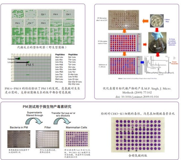 優(yōu)化二級代謝產(chǎn)物生成條件:如抗生素,細菌、真菌毒素的產(chǎn)生,將PM技術(shù)與抑菌圈法、色譜法,直觀顏色判斷法或活細胞測試等相結(jié)合,通過快速確定培養(yǎng)后PM板每個微孔中的苗液是否含有相應(yīng)的刺激代謝產(chǎn)物。