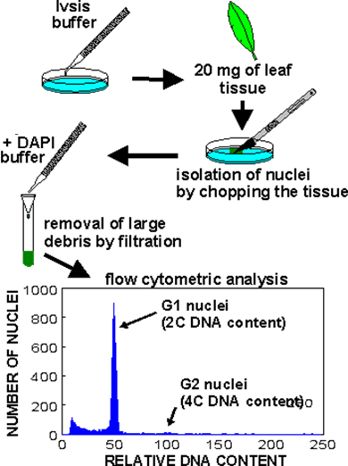 傳統(tǒng)的倍性鑒定主要采用常規(guī)壓片法統(tǒng)計(jì)染色體數(shù)目,但采用這種方法很難尋找到分裂中期染色體分散良好并可進(jìn)行計(jì)數(shù)的細(xì)胞,而且整個(gè)過(guò)程耗時(shí)長(zhǎng),檢測(cè)效率低。采用流式細(xì)胞術(shù)(Flow Cytometry,F(xiàn)CM)進(jìn)行倍性分析的方法簡(jiǎn)化了倍性分析的過(guò)程,可以快速準(zhǔn)確檢測(cè)同一物種范圍內(nèi)不同倍性的樣品。FCM作為一項(xiàng)快速、高效的檢測(cè)技術(shù),被廣泛應(yīng)用于細(xì)胞分類學(xué)、植物遺傳學(xué)及植物生理學(xué)等研究領(lǐng)域中。FCM常被用于鑒定植物倍性水平,通過(guò)檢測(cè)植株G0/G1峰的細(xì)胞核DNA含量可以判斷出植物的倍性。