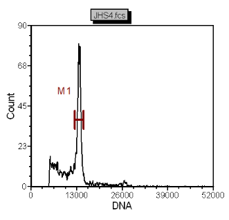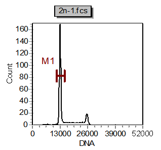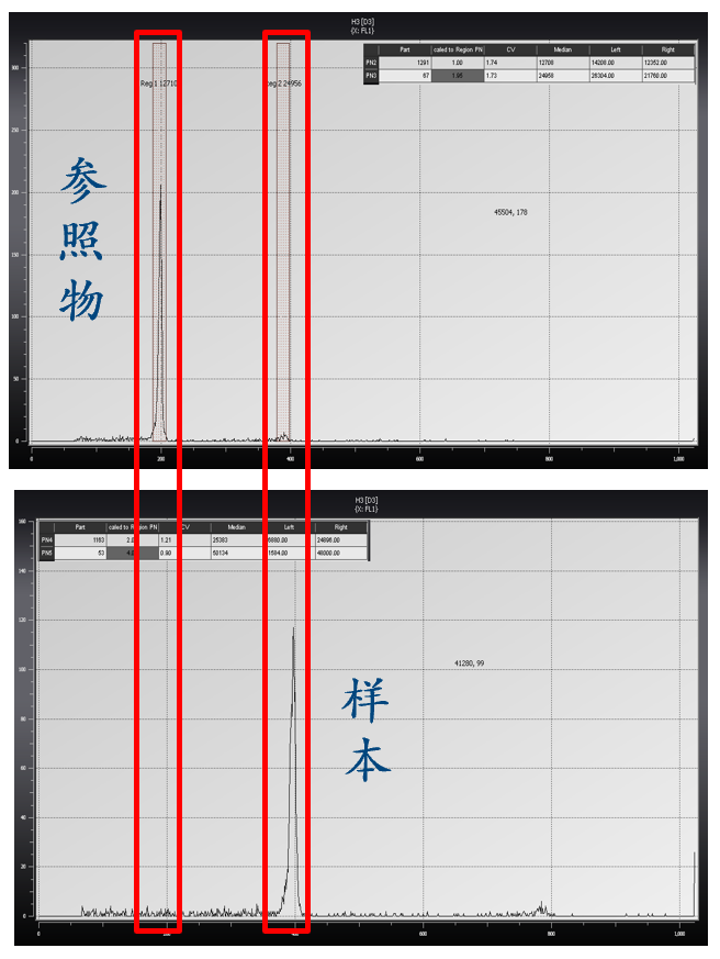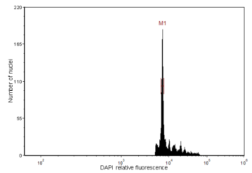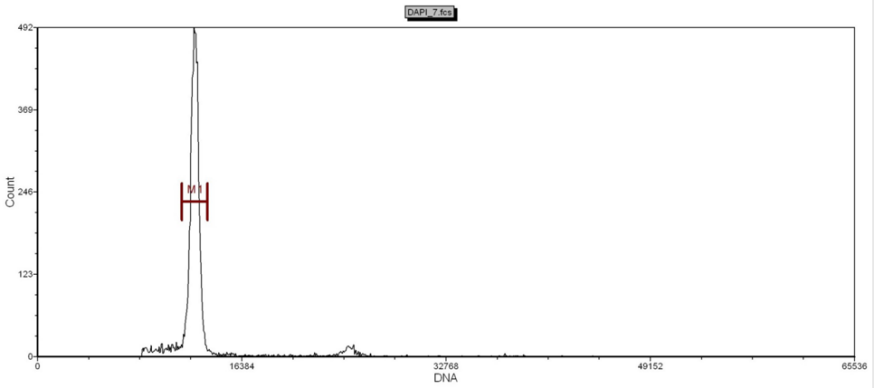 首先需要裂解液將組織中細(xì)胞核釋放出來(lái),并打開(kāi)DNA鏈,然后用DAPI染液將細(xì)胞核DNA上的A-T堿基對(duì)特異性染色,再用儀器檢測(cè)出被染色的A-T堿基對(duì)發(fā)出的熒光強(qiáng)度。比如二倍體的熒光強(qiáng)度是100(橫坐標(biāo)),那么單倍體的熒光強(qiáng)度就是50(橫坐標(biāo))??v坐標(biāo)是細(xì)胞數(shù)量的顯示,通常來(lái)說(shuō),信號(hào)峰高說(shuō)明信號(hào)比較好,雜質(zhì)少。